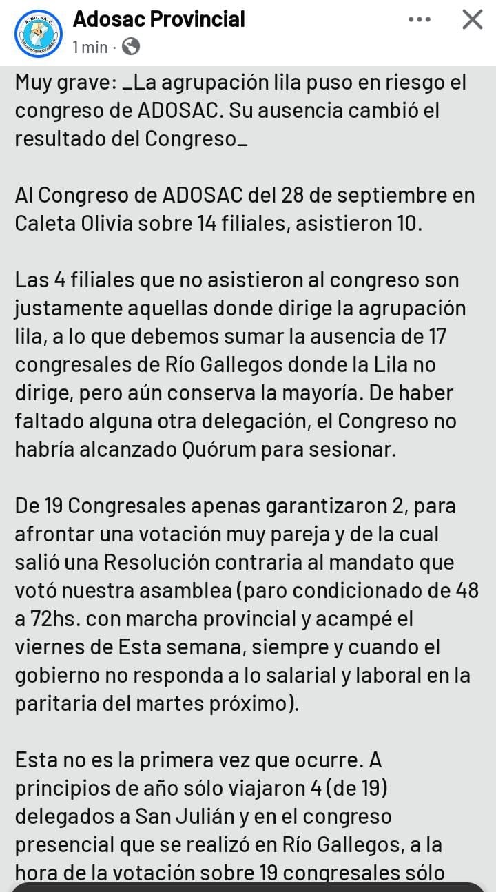 La Agrupación Lila salió al cruce tras críticas de la conducción provincial de Adosac, quienes a través una publicación en redes los responsabilizó por “haber puesto en riesgo el congreso” debido a la ausencia de congresales que integran el sector. El posteo fue eliminado minutos después de su difusión, y posteriormente publicado en la página de la filial Rio Gallegos.