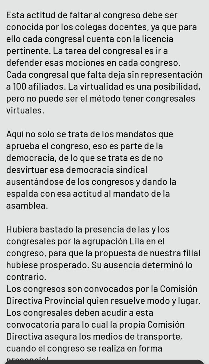 “Nunca salimos a denunciar como se salió deliberadamente a querer culpar a una agrupación para torcer el destino de un congreso. Y otra cosa, siempre hemos atendido los pedidos de las filiales, sabemos que un congreso cuando se mueve íntegramente está costando cercano a los 10 millones de pesos, y cuando hay filiales que han tenido dificultades para garantizar asistencia, nos han mandado notas así como mandó la agrupación Lila a la comisión directiva provincial para que dado la alerta naranja que regía por vientos, pudiera pasar de presencial a virtual, cosa que no prosperó”.