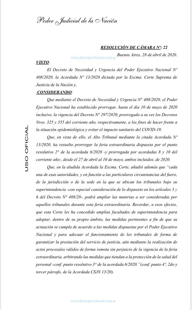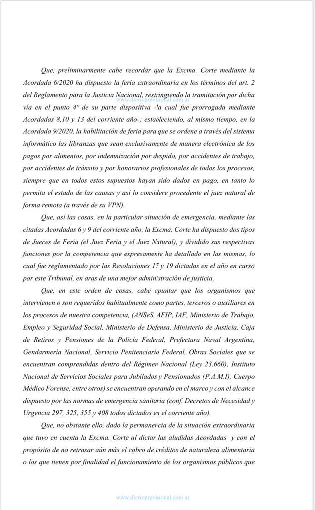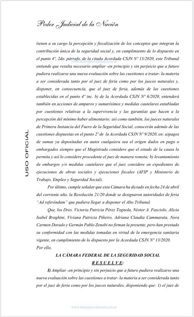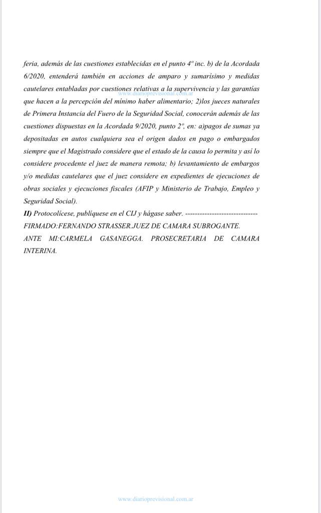 La medida dice en su articulo 2 que los jueces naturales de Primera Instancia del Fuero de la Seguridad Social, conocerán además de las cuestiones dispuestas en la Acordada 9/2020, punto 2º, en: a)pagos de sumas ya depositadas en autos cualquiera sea el origen dados en pago o embargados siempre que el Magistrado considere que el estado de la causa lo permita y así lo considere procedente el juez de manera remota; b) levantamiento de embargos y/o medidas cautelares que el juez considere en expedientes de ejecuciones de obras sociales y ejecuciones fiscales (AFIP y Ministerio de Trabajo, Empleo ySeguridad Social.