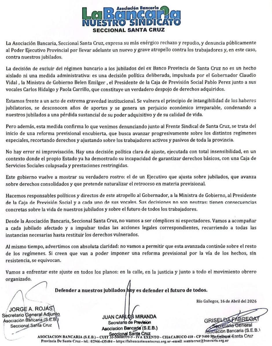 En diálogo con el programa El Oso, de El Caletense Radio, la secretaria general de La Bancaria seccional Santa Cruz, Griselda Fabregat, se expresó sobre la resolución tomada por la Caja de Previsión Social (CPS), que impacta de manera directa sobre jubilados y pensionados del histórico banco estatal, quienes dejarán de percibir sus haberes bajo el esquema bancario para pasar a cobrar como agentes de la administración central.