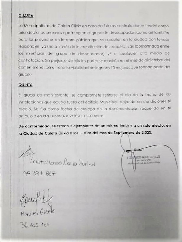 Sin embargo, desde el Municipio desmintieron esta información y difundieron el acta acuerdo donde se expresa claramente que el compromiso implica capacitaciones para 32 personas, asistencia financiera de solo 5 mil pesos mensuales a pagar desde el 9 de septiembre, y la prioridad en el caso de futuras contrataciones para proyectos de obras públicas con fondos nacionales.