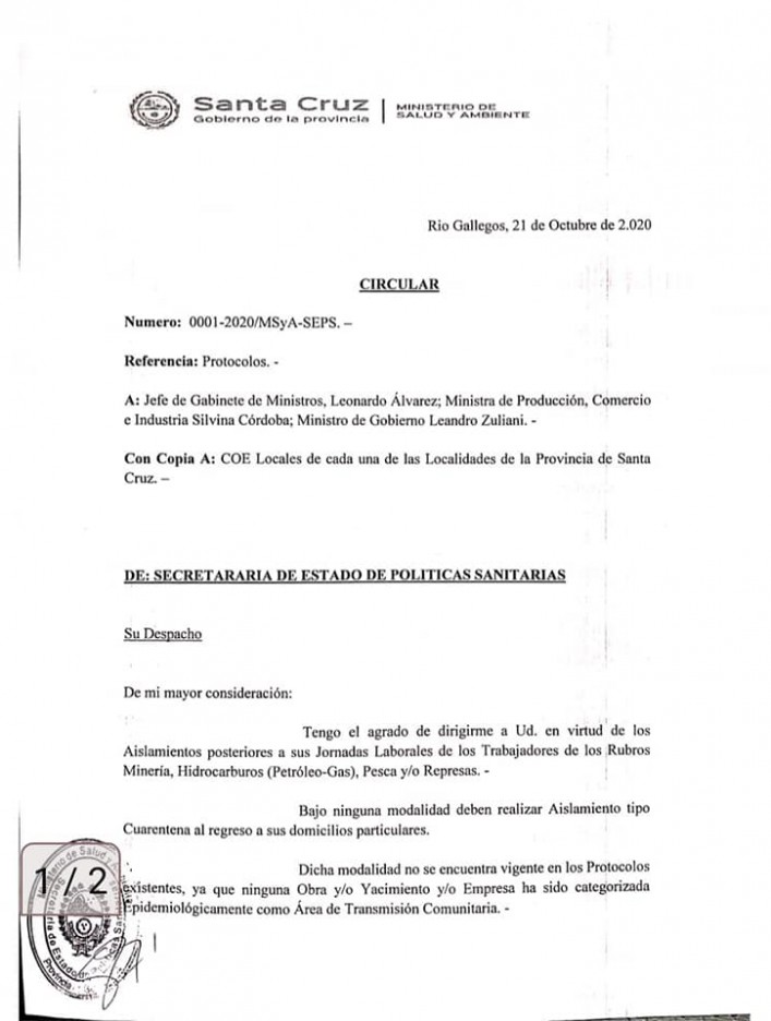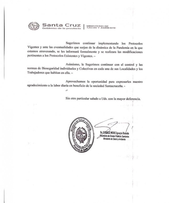 Copias del documento, firmado por el secretario Ignacio Suárez More, fueron enviadas a los COEs de las distintas localidades de Santa Cruz. Puntualiza en su letra que: “en virtud de los aislamientos posteriores a sus jornadas laborales de los trabajadores de los rubros minería, hidrocarburos (petróleo-gas), pesca y/o represas; bajo ninguna modalidad deben realizar aislamiento tipo cuarentena al regreso a sus domicilios particulares”