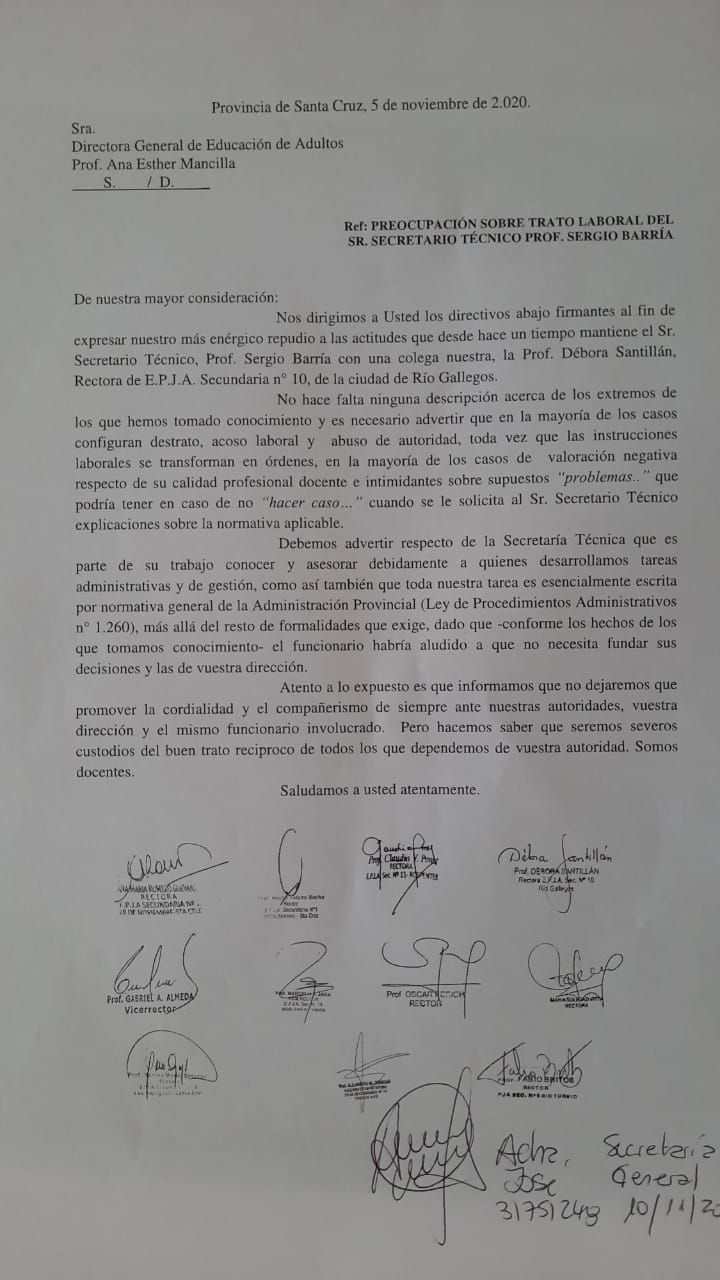 Los firmantes manifestaron su preocupación por el “trato laboral del señor secretario técnico profesor Sergio Barría”, y expresaron su “más enérgico repudio a las actitudes que desde hace un tiempo mantiene el señor secretario técnico con una colega nuestra, la profesora Débora Santillán, rectora de la EPJA secundaria número 10 de la ciudad de Río Gallegos”, dice la nota.